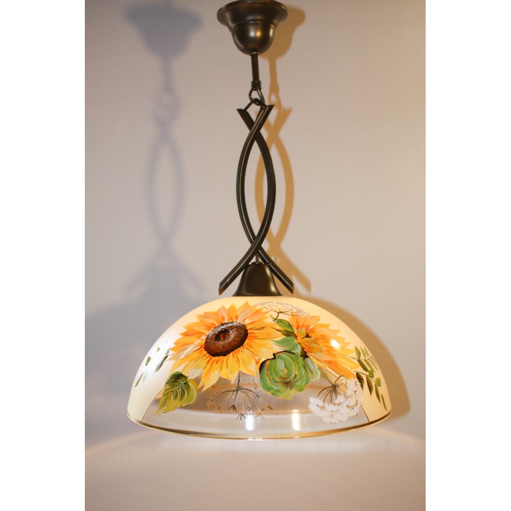 Tento originální kuchyňský lustr má stínidlo na výběr o průměru "30 a 35" cm, které je po obvodu ručně zdobeno květy slunečnic a spodní okraj zlatou linkou.