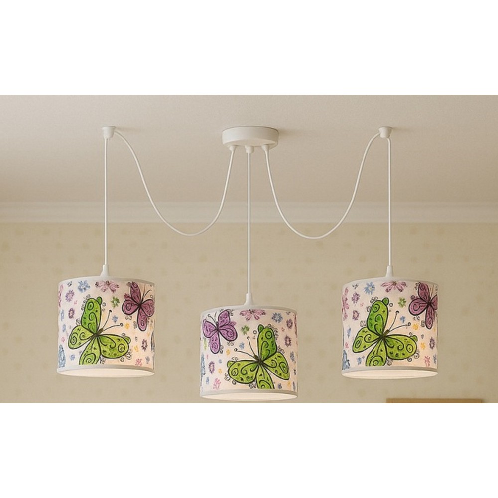 Originální a hravý lustr typu Pavouk s extra dlouhými kabely (300 cm). Rozmístěte stínidla po pokoji přesně tam, kde potřebujete světlo. Průměr stínidel 20 cm se vzorem motýlků vytvoří v dětském pokoji jedinečný designový prvek.