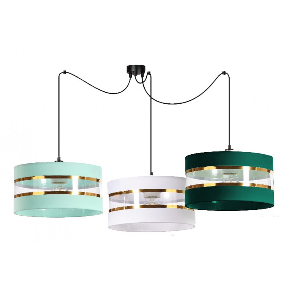Díky kombinaci kovu, textilních kabelů a elegantních stínidel se zlatými pásky působí svítidlo moderně a nadčasově. Hodí se do obývacího pokoje, jídelny, pracovny i otevřených interiérů.