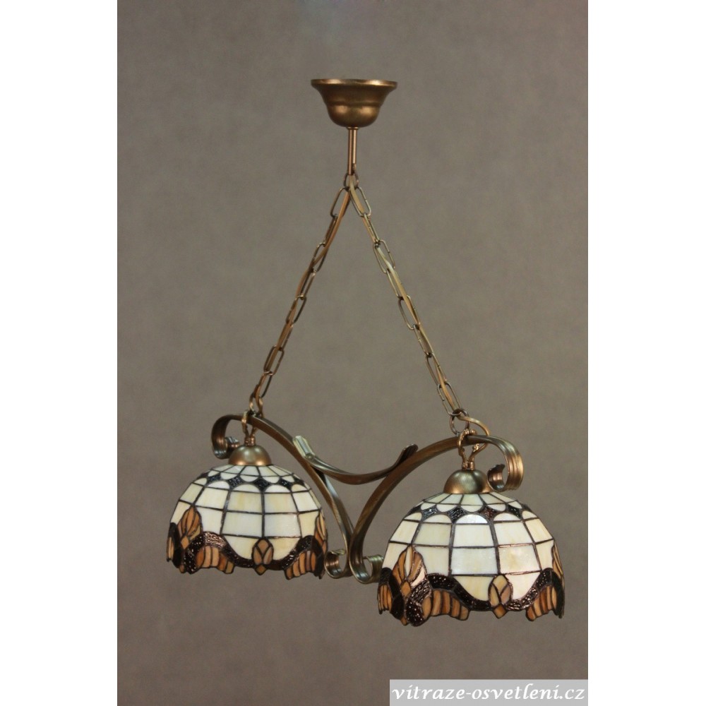 Lustr je osazen dvěma ručně vyráběnými vitrážovými stínidly, která vytvářejí příjemně rozptýlené světlo a navozují útulnou atmosféru.