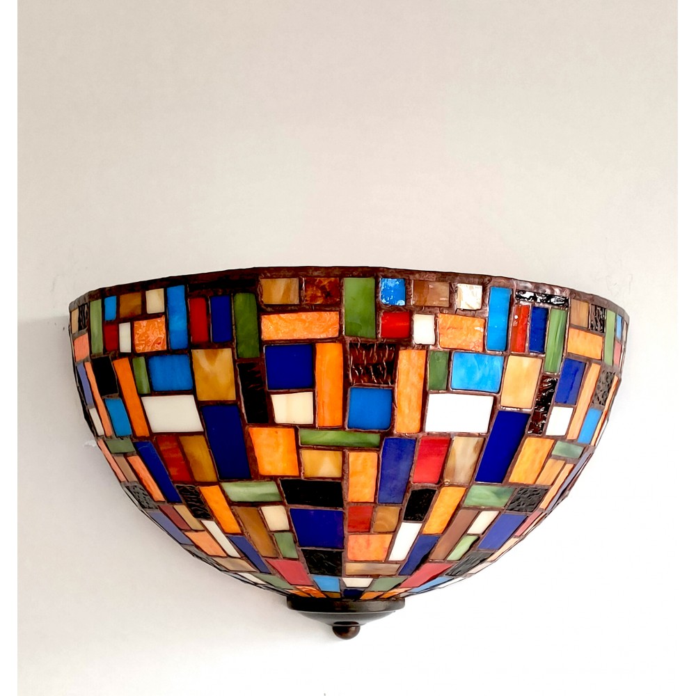 Vitrážová nástěnná lampa Moza Ø30 v Tiffany stylu dodá vašemu interiéru uměleckou duši. Ručně vyrobené barevné skleněné stínidlo o průměru 30 cm vytváří jedinečnou atmosféru a stává se dominantním dekoračním prvkem. Ideální pro obývací pokoje, ložnice i komerční prostory, tato lampa kombinuje nadčasový design s mistrovským řemeslem.